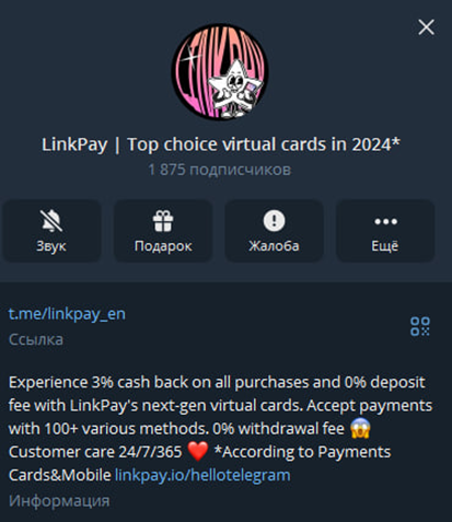 Компания имеет два телеграм-канала. Первый: LinkPay En. Он предназначен для английской аудитории. Канал создан почти 2 год назад и за это время на него подписалось 1 875 человек. Вовлеченность читателей составляет всего лишь 8%. Это значит, что большая часть подписчиков – это боты. Эту теорию также доказывает статистика отписок и подписок. За последний месяц от канала отписалось большое количество людей. Зачастую это удаленные аккаунты.