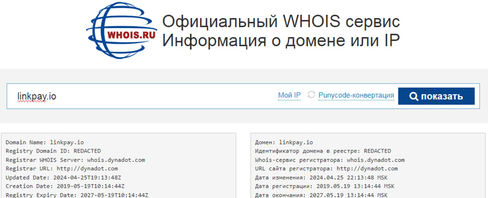 «ЛинкПэй» якобы зарегистрировано давно. Домен появился еще в 2019 году, а обозреваемая платформа взяла управление в апреле 2024 года. То есть, прошло больше года. Владелец площадки немного соврал о настоящем стаже работы. Скорее всего для того, чтобы создать впечатление надежного партнера.