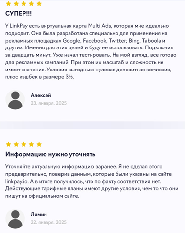 Отзывы о LinkPay были найдены лишь положительные. В них пользователи указывают пять звезд, но выписывают недостатки. Многие утверждают о том, что информация на сайте не всегда свежая и порой различается с действительностью. Из-за этого при покупке тарифа или оформлении карты можно случайно заплатить больше, чем указывалось. Пользователям не понравились ограниченные варианты пополнения счета и медленная обработка транзакций. Возможно, отрицательные отзывы удаляются. Инвесторы это поняли и стали писать их, но только оставляя пять звезд сервису.