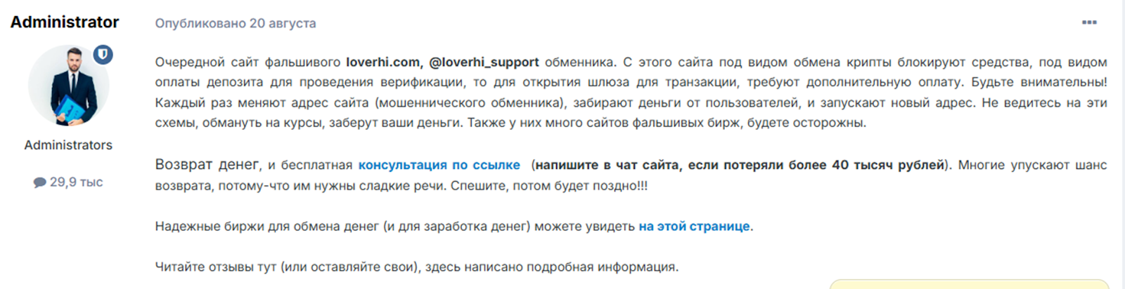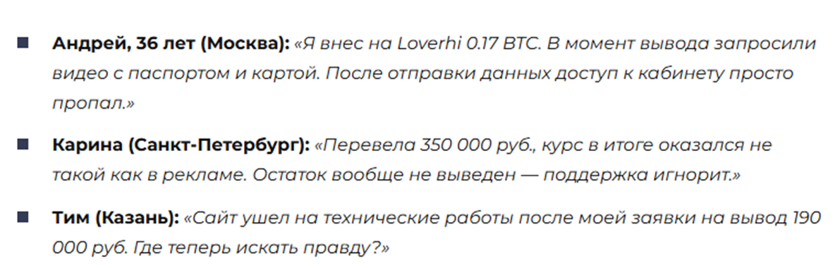 Отзывы на Loverhi лишь подтверждают, что сервис является мошенническим. Клиенты обменника столкнулись с воровством средств, отвратительной работой саппорта и несанкционированными блокировками.