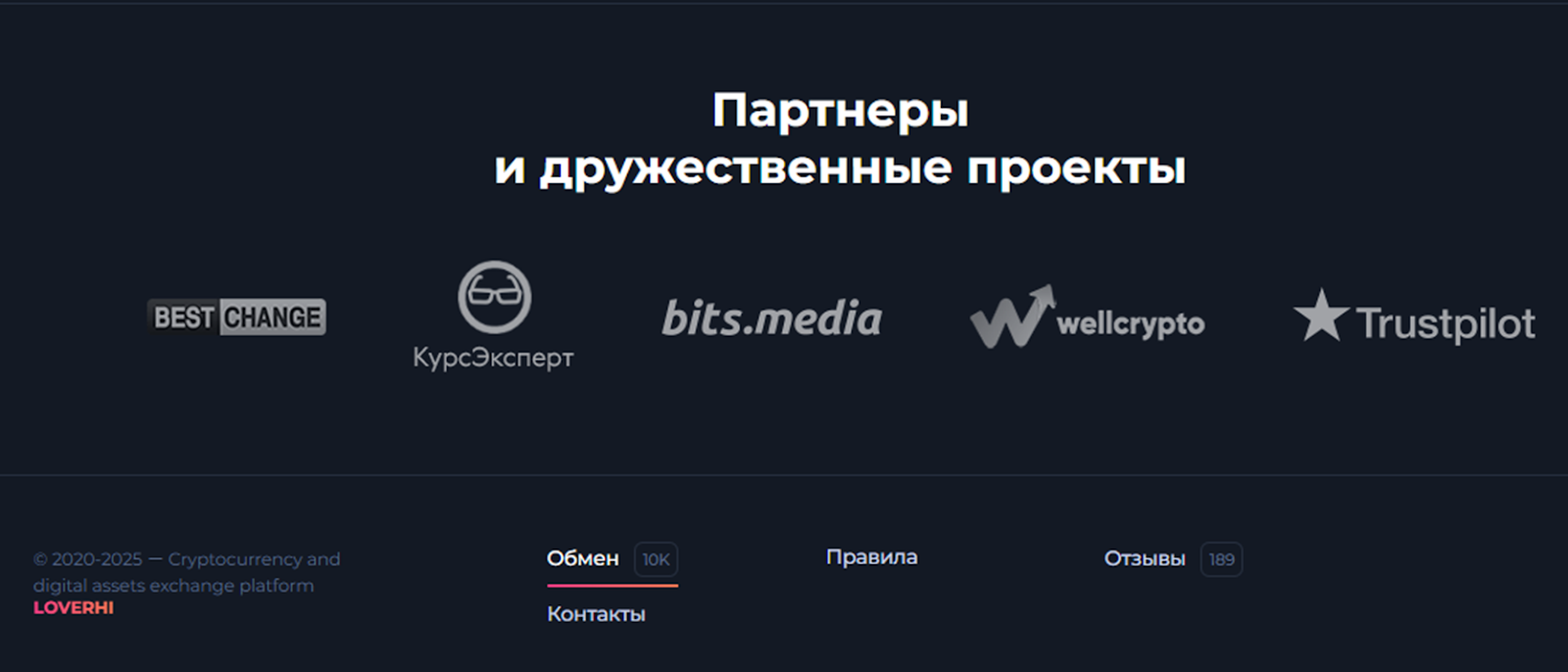 Loverhi – обменник, который крайне сложно назвать безопасным обменным сервисом. Начнем с того, что заявленное партнерство с крупными мониторингами – вранье. По факту, это лишь кликабельные логотипы мониторингов, которые ведут обратно на сайт обменника.