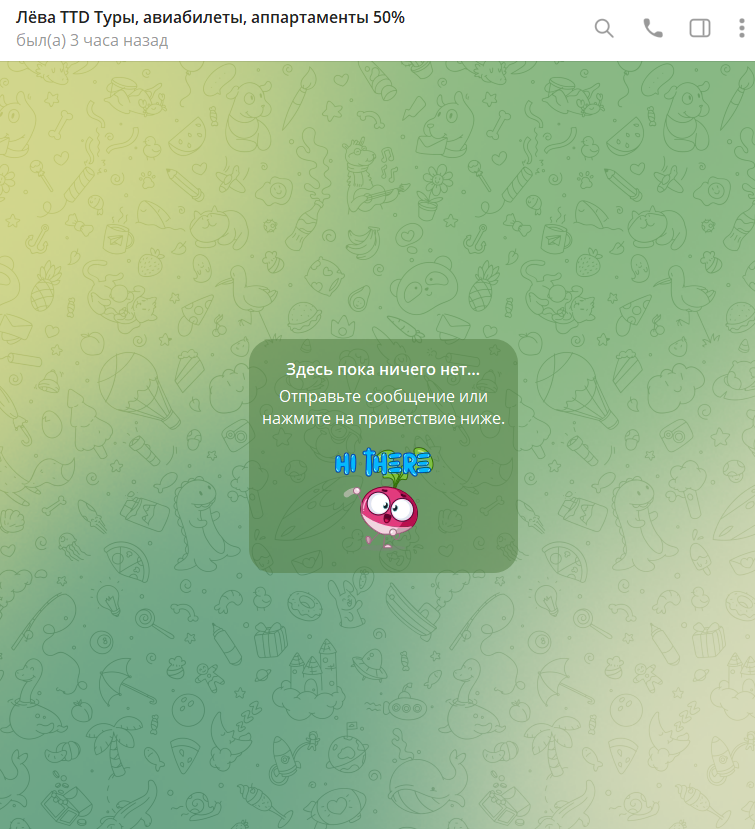 Канал «ЛеваТтд | Туры, авиабилеты, апартаменты | 50%» представляет собой личный чат менеджера. Сюда обращаются за покупкой билетов или бронью гостиниц.