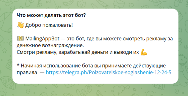После запуска бот Mailingappbot предлагает ознакомиться с основной информацией. У него есть даже раздел с правилами, которые можно назвать стандартными. Указано, что администрация бота получает деньги от рекламодателей, а затем вознаграждение отправляется пользователям. Якобы с ботом есть возможность зарабатывать более 1000 рублей в день.