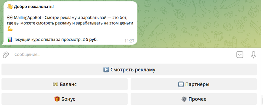 Доход в Mailingappbot составляет 2-5 рублей за 1 просмотр. В интерфейсе есть несколько вкладок с информацией. Там можно узнать баланс, получить бонус и проверить партнеров. Предлагается раздел «Прочее», в котором пользователи находят историю выплат, новости и сведения о выплатах. Доступна вкладка поддержки, но она не работает.
