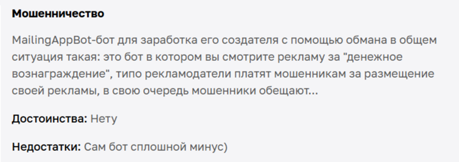 Отзывы о телеграм-боте Mailingappbot отрицательные. Такие комментарии можно найти на многих сторонних сайтах. Пользователи пишут о мошенничестве. Хоть система предлагает заработок, на самом деле клиенты не могут выводить деньги. Положительные отзывы о данном проекте мы не нашли.