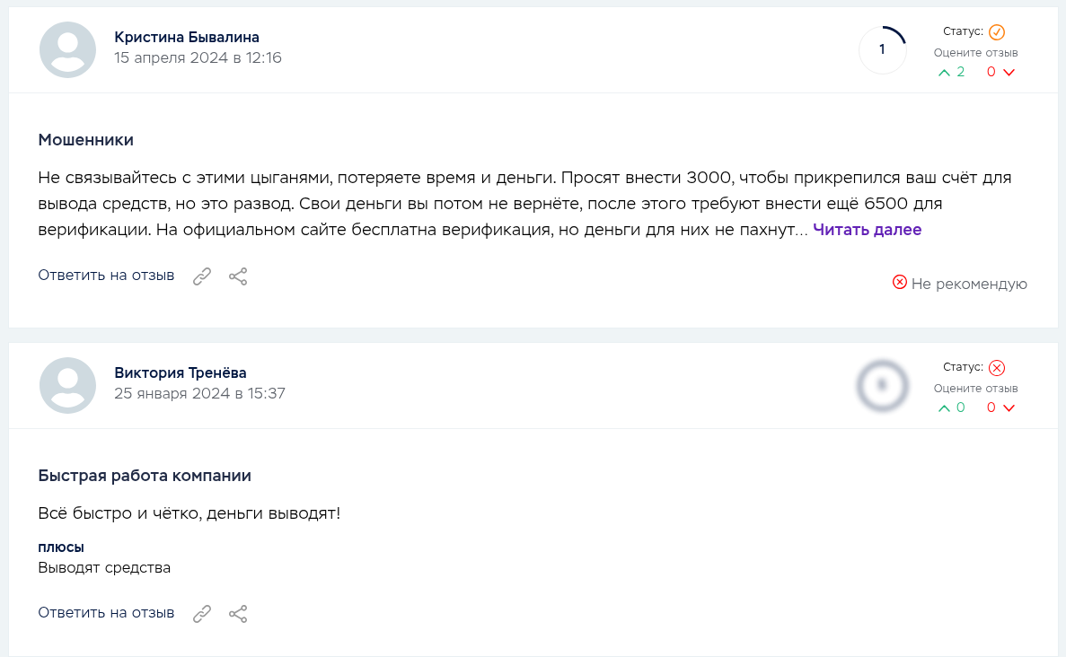 С другой стороны — хорошие отклики. Они короткие и простые, даже чуть шаблонные, но выглядят естественными. В них пишут, что компания работала быстро и без проблем выводила деньги.