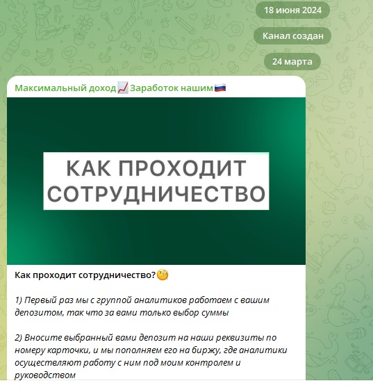 Канал в Телеграм под названием Максимальный Доход Заработок Нашим создан 18 июня 2024 г. Однако активная деятельность началась лишь с 24 марта 2025. Вся предыдущая история удалена.