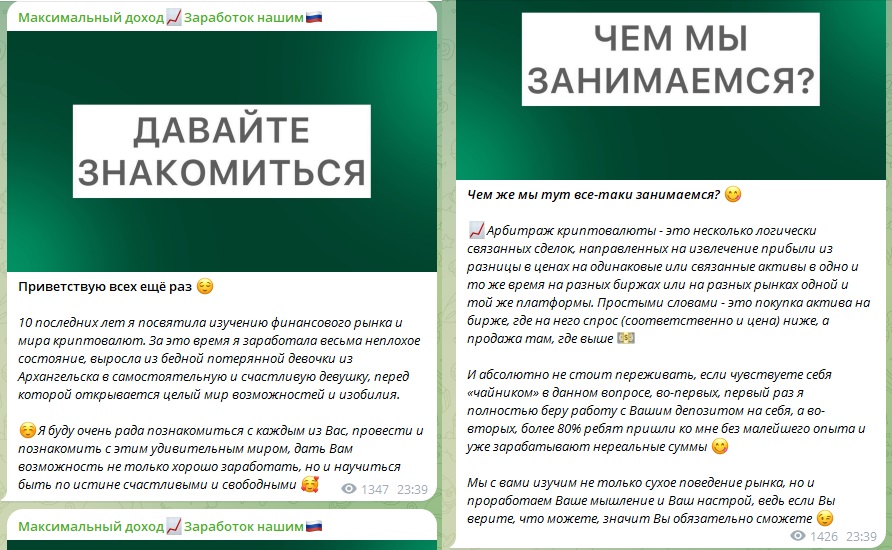 Админ канала работает под ником Наталья. В посте-презентации она рассказывает, что уже 10 лет изучает финансовые рынки и криптовалютный мир и заработала на этом солидный капитал. Из “бедной, потерянной девочки” из Архангельска она выросла до крупного инвестора с собственной командой. Основной доход ей приносит арбитраж криптовалют.