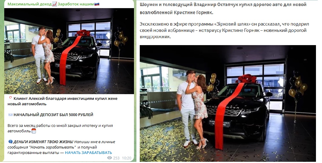 Как доказательство честной работы, Наталья размещает скрины переписок с клиентами, видеоотзывы, а также истории людей, которые благодаря сотрудничеству с ней, смогли воплотить в жизнь свою мечту. Только все они фейковые, их создали один раз и постят по кругу. В качестве примера приведем публикацию об Алексее, который всего за месяц смог со стартовых 5К руб. закрыть ипотеку и купить жене шикарный автомобиль. Есть даже фото счастливой пары на фоне авто. На самом деле — это картинка из новости пятилетней давности, в которой рассказывали как шоумен Владимир Остапчук купил машину для своей девушки — Кристины Горняк.