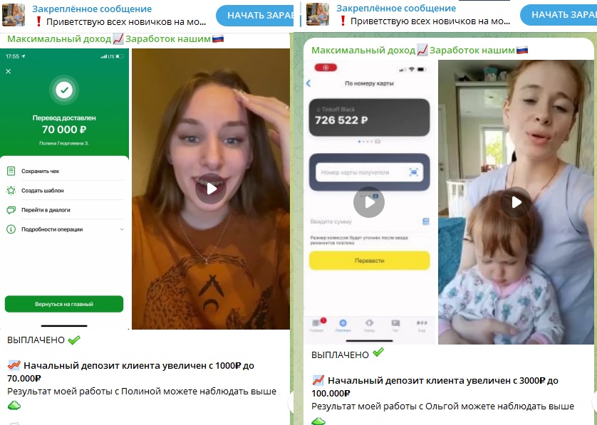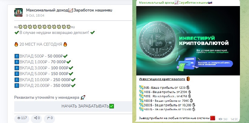 Теперь Наталья предлагает свою помощь всем, кто попал в сложную финансовую ситуацию. Она заключается в совместных торговых сессиях, которые якобы приносят не менее 100 иксов на каждой сделке. Несколько раз в день девушка размещает объявления о новом наборе с указанием суммы вкладов и ожидаемых выплат. Депозиты принимает в рублях или в долларах. Минимальная сумма 500 руб. — доход 50К руб. или 50$ — прибыль 1 200$.