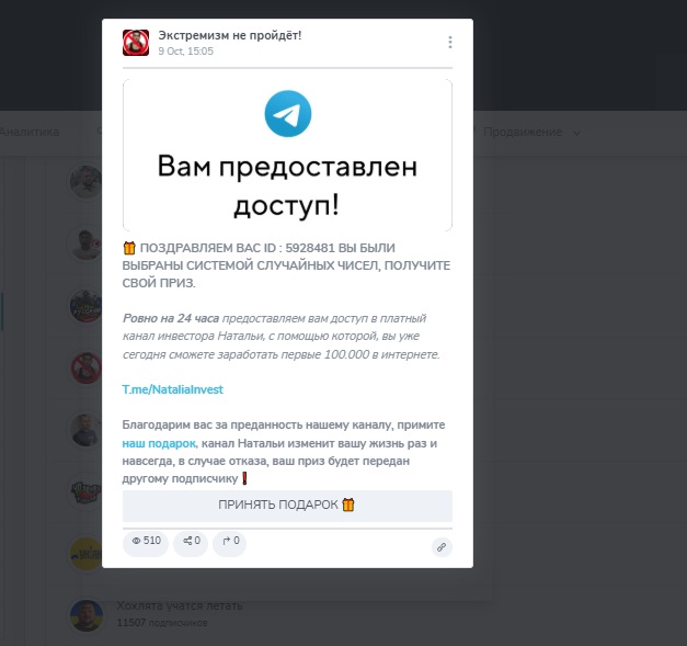 На паблике почти 21К подписчиков, но большая их часть — боты. Публикации читает всего 2%, реакции и комментарии заблокированы. Количество подписчиков поддерживается за счет притока новых пользователей по рекламным объявлениям такого плана: