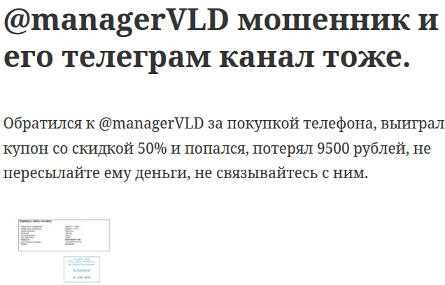 ManagerVLD — сотрудник интернет-магазина, где каждый пользователь может покупать электронику по самым низким ценам. Сниженную стоимость менеджер Владислав аргументирует наличием «связей» на таможне и складах, которые как раз и дают скидку.