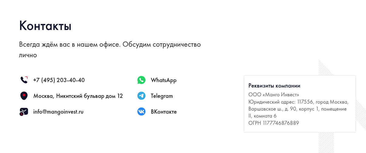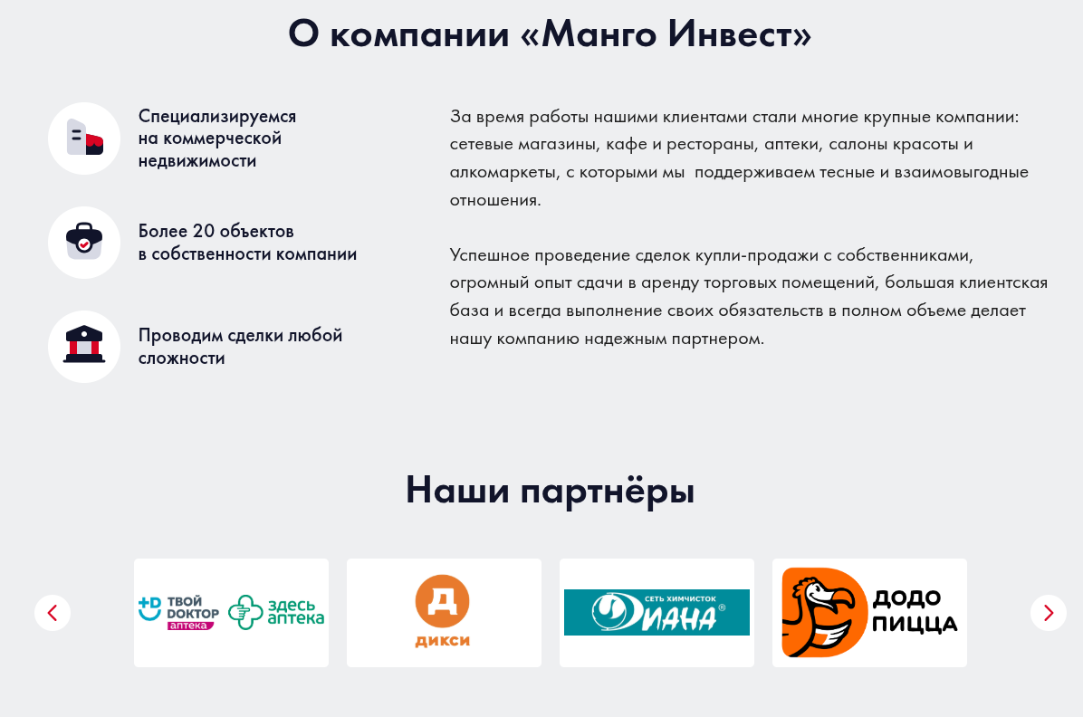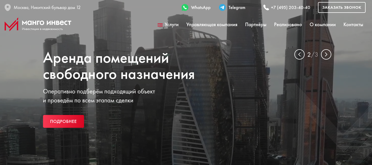 «Манго Инвест» – инвестиционно-девелоперская контора, где нам предлагают вложиться в коммерческую недвижимость. Команда обещает подобрать ликвидные объекты с готовыми арендаторами и попутно продает в рассрочку земельные участки в Подмосковье.