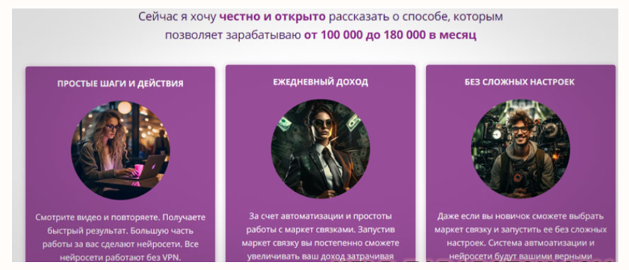 «Маркет Связка» – это обучающий курс, где обещают доход от 100 000 рублей в месяц. Схема такая: привлечение трафика с помощью нейросетей и сбор «прибыльных рекламных связок». Автор заявляет, что прибыль якобы начисляется автоматически каждый день.