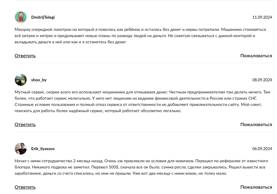 Пользователи пишут, что сервис часто списывает комиссию, которой изначально не было в договоренности. Бывшие клиенты сообщают, что переводили деньги партнерам через «МассПей», но средства так и не дошли, а попытки добиться возврата превращались в бесконечный диалог с саппортом.