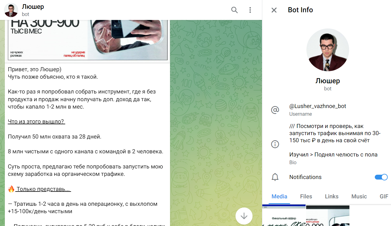 Для того чтобы изучить информацию об услугах предпринимателя, нужно запустить бота Lusher vazhnoe bot. Он сообщит пользователям о том, что Макс Люшер знает методы для выхода на прибыль в 1-2 млн руб. в месяц, чаще всего такие обещания исходят от проектов с признаками развода. Как рассказывают юзерам, нужно тратить 1-2 часа в сутки. Пользователям предложено несколько бесплатных видео с кратким разбором таких тем: заработок с помощью ИИ, выбор вирусной тематики, монетизация трафика, окупаемость блога и прочих.После того как пользователи посмотрят некоторые материалы с тг-бота, Макс Люшер оставляет линк с информацией о способах заработка, примерами дохода других участников. Предприниматель предлагает вступить в закрытый клуб, и в нем обещает: