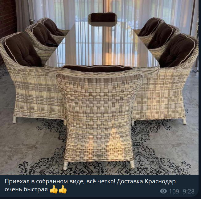 В телеграм-магазине «Уютный дом Искуственный елки Мебель для дома» предлагаются различные варианты мебели, которые пользователи могут купить себе с доставкой в любой регион страны. Доставка занимает от 1 недели до 10 дней. Пользователям предлагают мебель для дома и улицы. Тут можно найти как целые наборы, так и отдельные предметы. Средняя стоимость составляет несколько тысяч рублей.