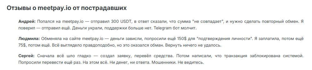 В сети мало отзывов об обменнике Meetpay io, позитива среди них не наблюдается. После перевода средств под разными предлогами с клиента требуют дополнительных платежей — налоги, верификация, ошибка транзакции и так далее. В случае отказа блокируют доступ к сайту. Получить обратно вложения невозможно.
