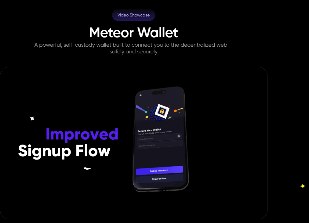 Meteor Wallet – это некастодиальный криптовалютный кошелек на блокчейне NEAR Protocol. Проект разработан компанией METEOR LAB PTE. LTD., которая зарегистрирована в Сингапуре. Компания получила seed-финансирование при поддержке NEAR Foundation, стратегических фондов и ведущих проектов экосистемы NEAR.