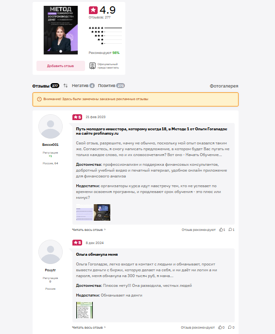 ProFinansy study предоставляет услуги от лица ООО «МАФК», это компания с миллионными оборотами, давно существующая на рынке. Также Ольга причастна к нескольким другим крупным организациям в направлении образования, но об ее инвесторском доходе известно не так много. У Гогаладзе есть несколько публичных счетов на биржах, которые подтверждают, что у нее есть в управлении активы на сотни миллионов, но проверить каждую из сделок просто так невозможно.