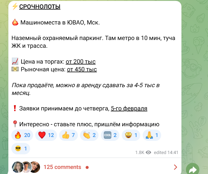 - Сообщения об объектах недвижимости, которые выставлены на торги. Админ выдает о них информацию в личных сообщениях и курирует во время аукциона.