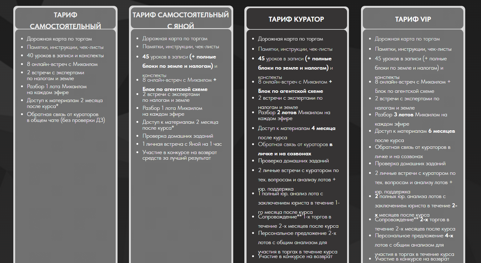 Формат обучения комбинированный: видеоуроки, задания, разборы реальных лотов, чат с кураторами и доступ к сообществу выпускников. Пользователям обещают, что курс можно окупить за счет экономии на агентской комиссии или участия в первых торгах. Линейка тарифов широкая — от самостоятельного формата без проверки заданий до ВИП-пакетов с персональным сопровождением, юридическим анализом лотов и участием автора в стратегии инвестора. В более дорогих тарифах предусмотрено реальное сопровождение торгов и компенсации отдельных расходов, что отличает курс от типичных инфопродуктов без практики.
