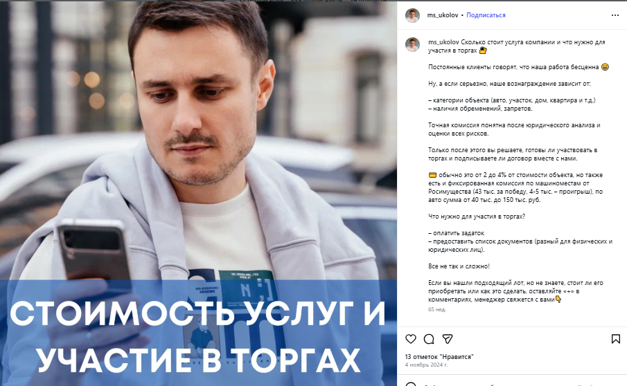 Из других платных услуг Уколова — полное сопровождение клиента для участия в торгах. Услуга оформляется документально — заключается договор. Стоимость в среднем 2-4% от стоимости объекта, плюс фиксированные комиссии. Например, по машиноместам от Росимущества это 43 тыс. руб. за победу и 4-5 тыс. за проигрыш, по авто 40-150 тыс. Точная сумма комиссии озвучивается только после юридического анализа и оценки рисков.