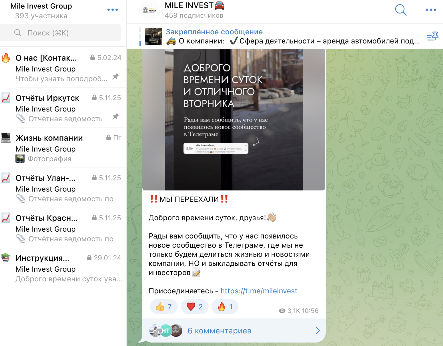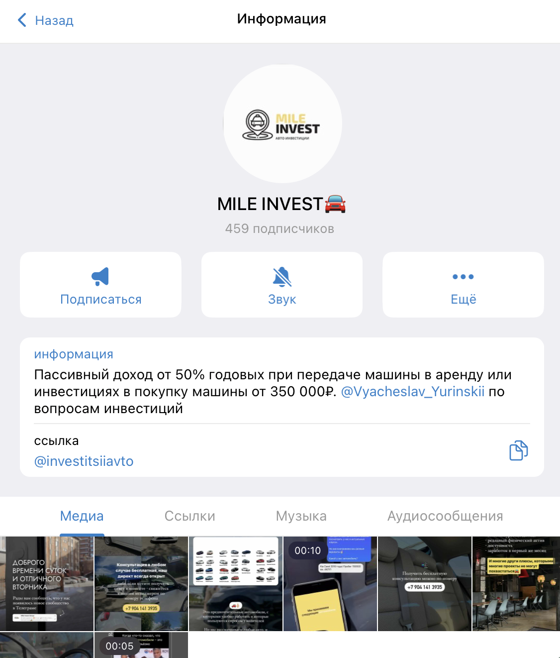 Основатели «MileInvest» придумали, как на машинах зарабатывать профит, причем пассивно. Проще говоря, вы вкладываетесь в автомобиль. Они его выводят в аренду, а вам поступает доля с доходов. По данным в тг, компанию связывают с Вячеславом Юринским (Vyacheslav Yurinskii).