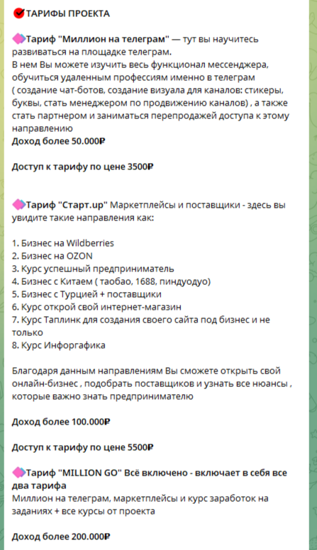 «Проект Million Go Бизнес в интернете» – бесплатная платформа для продажи сомнительных курсов. Лента канала даром знакомит посетителей с обещаниями огромных заработков и рекламой курсов. Сами же курсы реализовываются на сайте millionontelegram ru. Здесь можно купить программы: