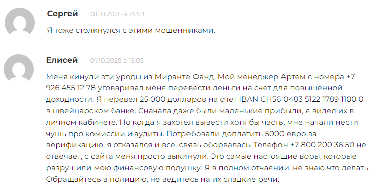 Люди, пытавшиеся заработать денег на вложениях в портал «Миранте Фанд», жалуются, что руководители компании их обманули, раскрутили на крупное пополнение депозита, а потом просто заблокировали аккаунт. Мошенники из «МФМ» используют проверенную методику обмана. В реальности деятельность scam сервиса не регулируется. От Центрального Банка РФ лицензии у сомнительной фирмы нет. Все условия сотрудничества с пользователями, опубликованные на официальном сайте Mirante Fund Management Com, не соблюдаются и к реальному положению дел отношения никакого не имеют. Интернет-филиалы похожих «кухонь» закрываются с впечатляющей частотой. После того как аферисты разведут на деньги приличное количество юзеров, мошенники «сворачивают лавочку» и регистрируют в сети новое название, сохраняя при этом суть скам-проекта.