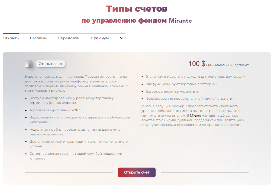 «Миранте» предоставляют аудитории 4 направления инвестирования: криптовалюта, фондовая биржа, Форекс и товары.