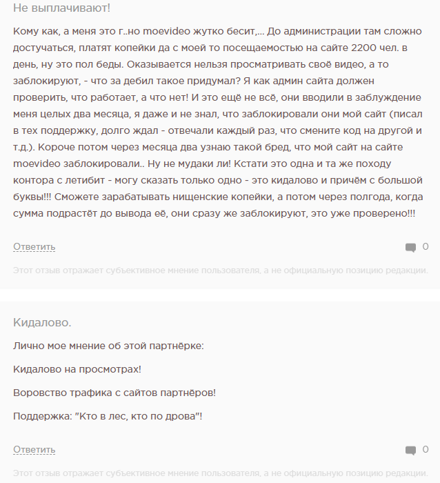 При этом в негативных сообщениях люди утверждают, что им платят “копейки”, а также блокируют в сервисе по непонятным причинам. Работой тех. поддержки MoeVideo многие тоже оказались недовольны.