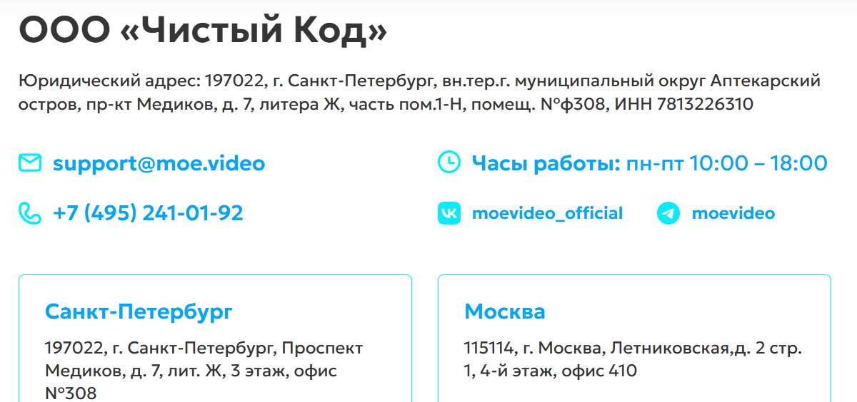 Тем не менее мы не можем отметить моменты, которые все же позволяют на определенном уровне доверять компании. Она как минимум имеет юридическую регистрацию как ООО Чистый Код. В разделе с контактами представлены номера телефонов, почты, и даже два адреса в Москве и Санкт-Петербурге.Сведения о команде проекта в отдельном разделе тоже кажутся положительным моментом, но стоит отметить, что в интернете об этих личностях либо очень мало информации, либо вообще нет.