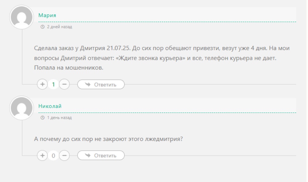 Например, пользователь Мария сообщает, что сделала заказ 21 июля. Спустя несколько дней ей продолжают обещать доставку, но товар так и не прибыл. На просьбы дать контакты курьера продавец лишь отмалчивается или дает шаблонный ответ.