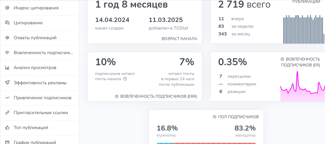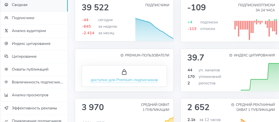 Подписчиков у сообщества свыше 39 000. На первый взгляд аудитория неплохая, но вот есть вопросы к активности, которые мы решили с помощью TGStat. Анализ показал, что старые пользователи активно покидают проект — свыше 2400 человек за месяц. Новых подписчиков команда привлекала за счет рекламы — индекс цитирования 39.7.