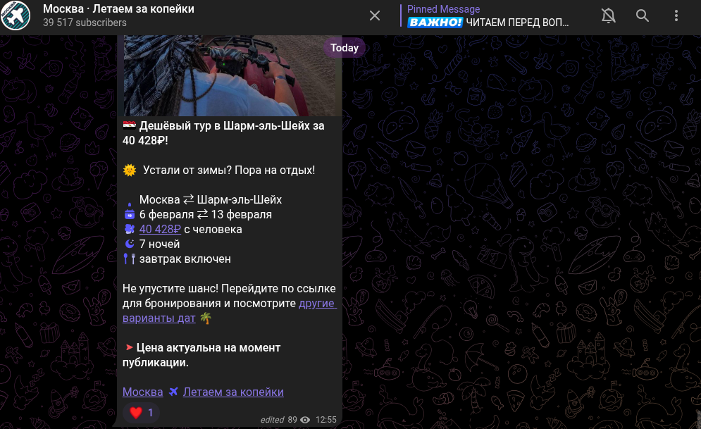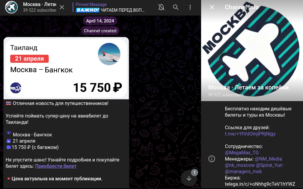 Мы рекомендуем игнорировать телеграмм-канала «Москва Летаем за Копейки», потому что ничего, кроме потери денег, вы не получите. Команда, прикрываясь якобы дешевыми билетами, обманывает доверчивых пользователей: