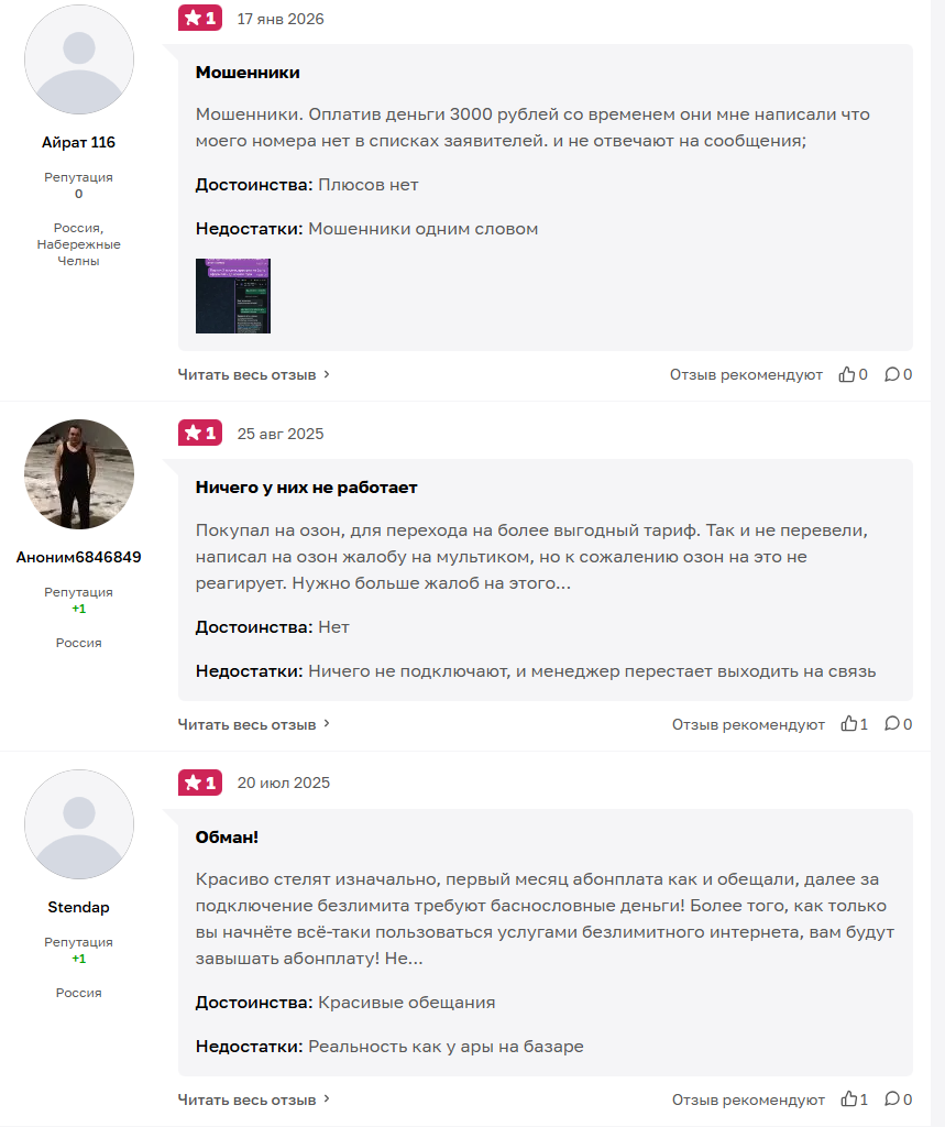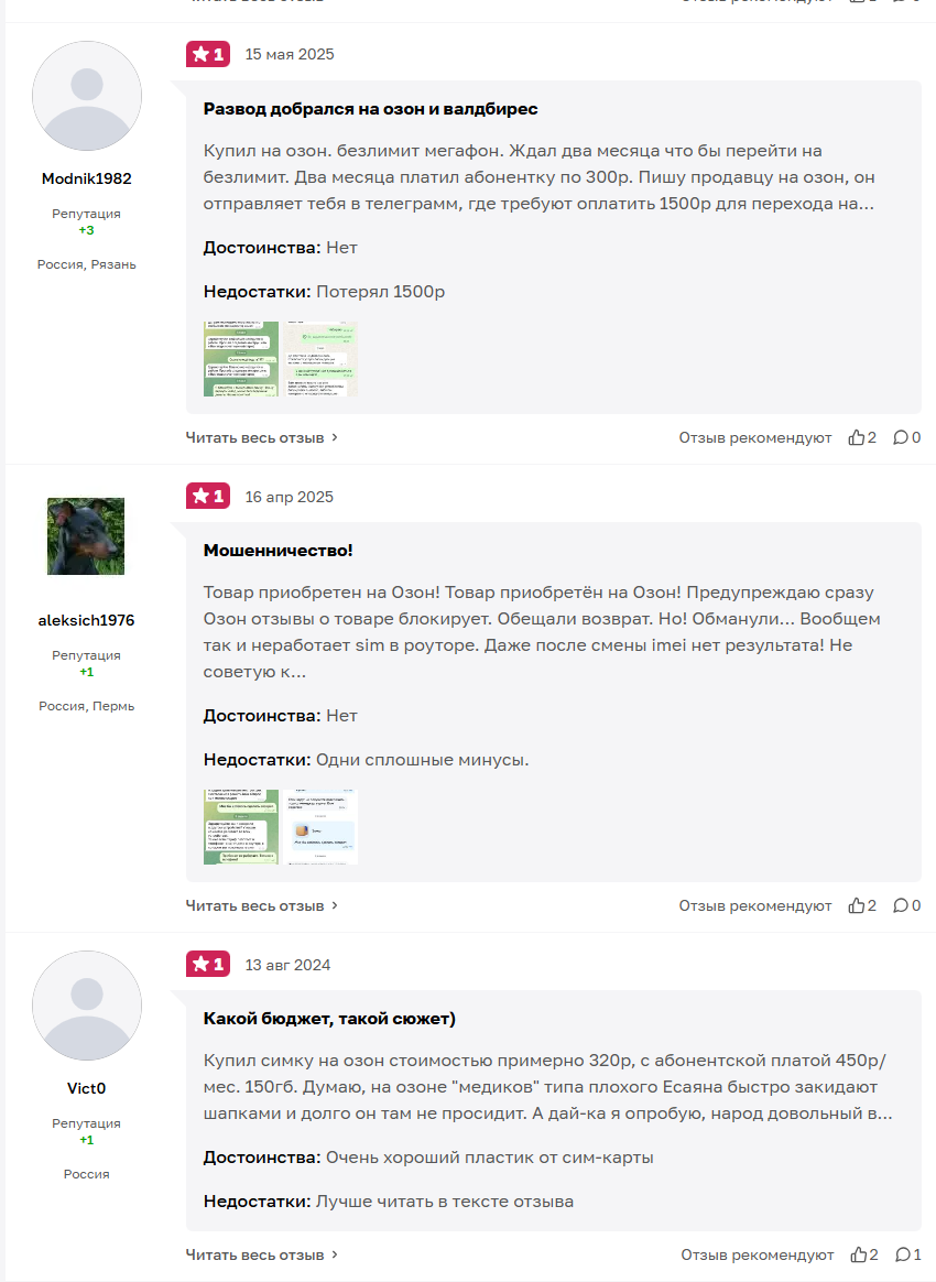 Если отслеживать негативные отзывы о Мультиком, то можно предположить, что проект работает с конца 2023 года. Изначально создатели скам-схемы продавали симки на Озон. При этом в отзывах пользователей фигурирует информация, в которой говорится, что они постоянно создавали новые карточки товаров на Озоне, чтобы скрывать негативные отзывы на старых.