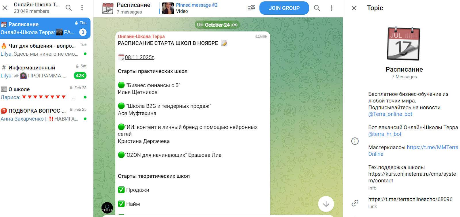 Из категорий доступна “Расписание”, в которой представлены актуальные даты старта обучения. В разделе “Информационный” админы рассказывают о правилах комьюнити, а в “О Школе” говорят о базовых сведениях проекта. В категории “Чат” пользователи могут проводить дискуссии. Другое тг-сообщество проекта можно найти по никнейму terra_priority.