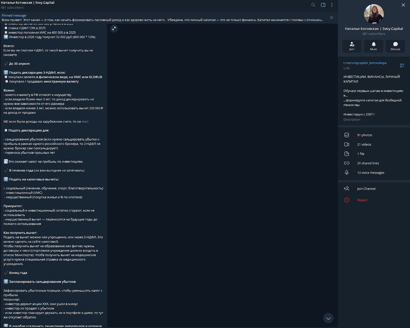 Аудитория тг-паблика «Наталья Котовская Svoy Capital» составляет примерно 500 человек, публикации чередуют обзоры рынка и короткие заметки из жизни. Юридические реквизиты, политика конфиденциальности и договор оферты, которые используются при оказании платных консультаций, на канале не размещены.