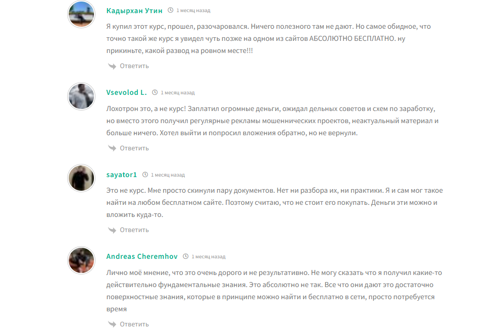 Некоторые респонденты указывают на несоответствие цены и наполнения. По их мнению, формат напоминает общий курс финансовой грамотности без глубокой проработки налоговых аспектов и юридического оформления инвестиций. Положительные оценки встречаются реже и чаще касаются простого языка объяснений, что действительно полезно новичкам.