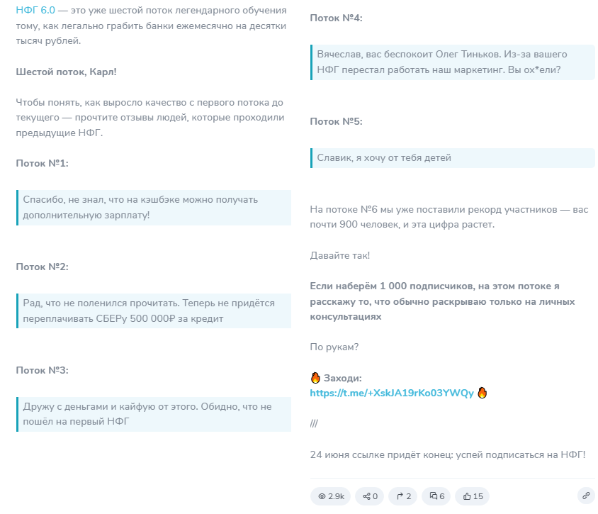 Мы не рекомендуем подписываться на данный тг-канал и тем более переходить по реферальным ссылкам админа. Если вы уже сталкивались с «НФГ Грабитель банков», оставьте свое мнение о нем в комментариях. Другие обзоры коучей и тренеров читайте на нашем сайте, в статьях мы разбираем проекты, которые действительно могут научить правильно распоряжаться деньгами.