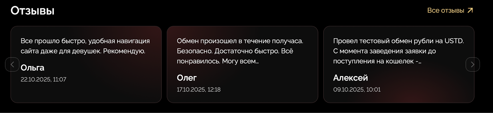 Сильно снижает уровень доверия к обменнику их политика «дарим криптовалюту за положительный отзыв». Данный ход даже не скрывается: «акция» заявлена прямо на главной странице сайта. Пользователям обещают начислить 3 USDT за хвалебный комментарий. Столь примитивная попытка проявить лояльность негативно сказывается на репутации проекта.