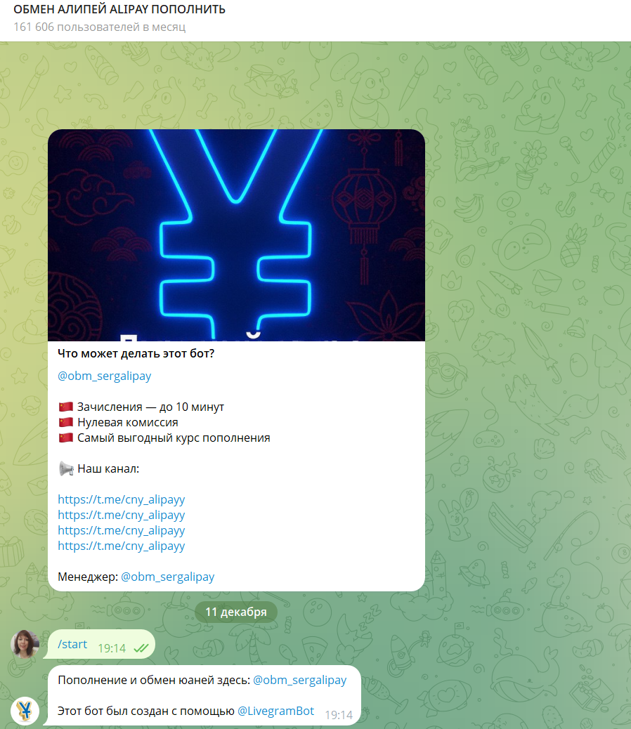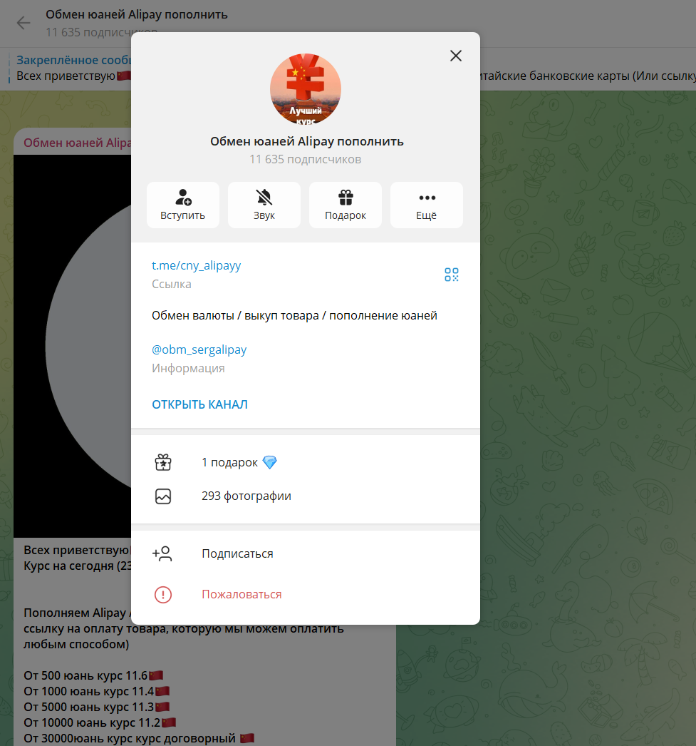 Канал «ОБМЕН АЛИПЕЙ ALIPAY ПОПОЛНИТЬ» – рискованный и сомнительный проект. Мы советуем с ним быть осторожнее.