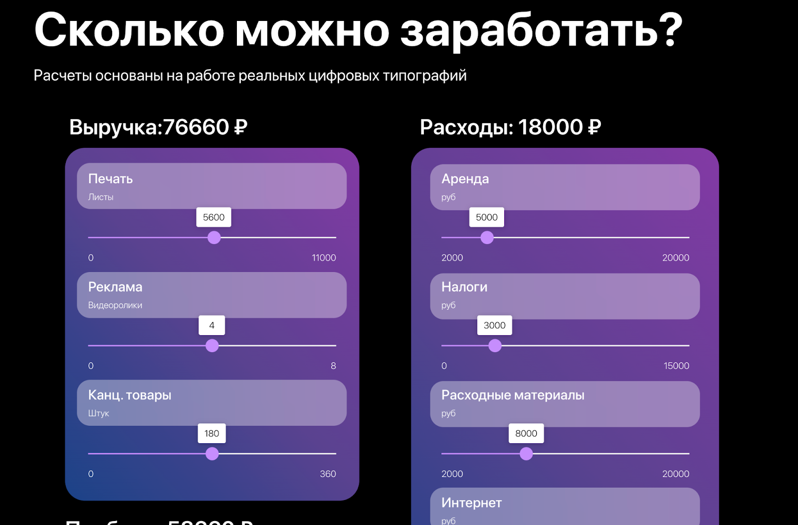 Франшиза Офсет заявляет пакет входа от 75 000 рублей и обещает окупаемость в разумные сроки при средней выручке, представленной на сайте. На лендинге также указываются прогнозы выручки и маржинальности, примеры и расчеты окупаемости. В оферте подчеркивается, что эта цифровая типография, а не классический офсет, хотя бренд используют словесную аналогию для простоты восприятия.