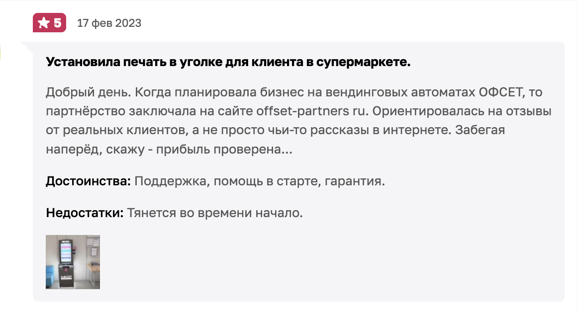 Сбор и проверка отзывов о франшизе Офсет показали, что в сети представлены преимущественно собственные публикации проекта или негативные комментарии людей. Пользователи жалеют потраченное время и прямо называют франшизу Офсет разводом. Есть также и редкие положительные отзывы о работе Офсет Цифровая Типография.