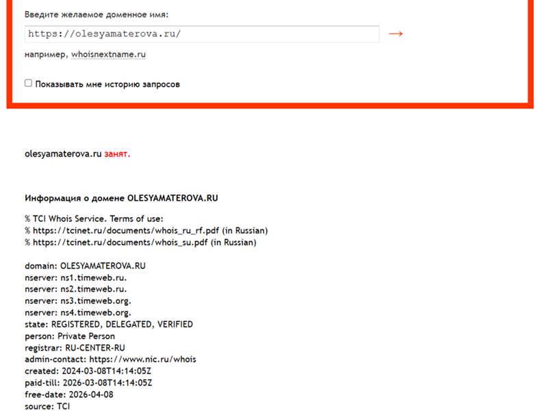 На сайте Olesya Materova указан срок работы площадки – 2017-2024 гг. На самом деле доменное имя зарегистрировано лишь в 2024 году, но только в 2025 перешло к образовательному ресурсу этого коуча. Наша проверка на надежном сайте Whois-Service показала, что адрес сайта продлили до 08.03.2026 г.