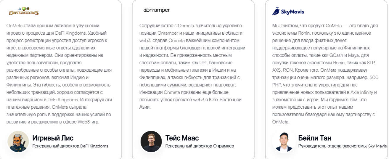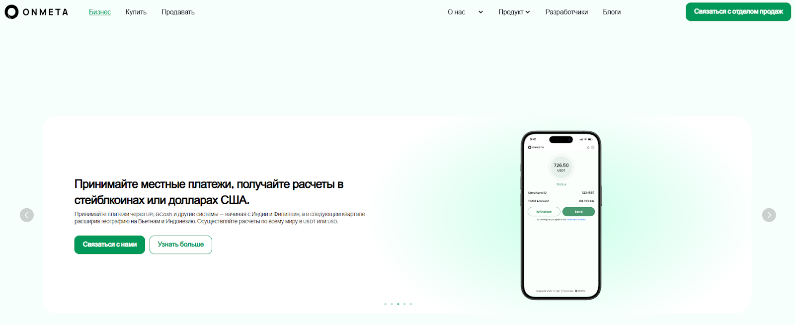 Onmeta делает B2B-решения для криптоиндустрии. Основная задача – встраивать фиатные платежи на сайты. Это позволяет обычным пользователям покупать криптовалюту за местные деньги без сложных манипуляций.
