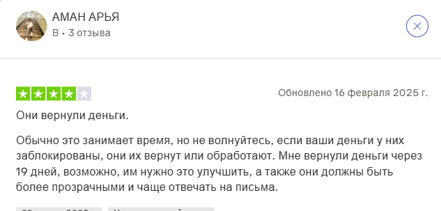 Хвалят скорость обработки. Операции проходят за минуту. Техподдержка возвращает заблокированные деньги, хотя ждать приходится до трех недель. Один пользователь получил возврат через 19 дней после обращения.