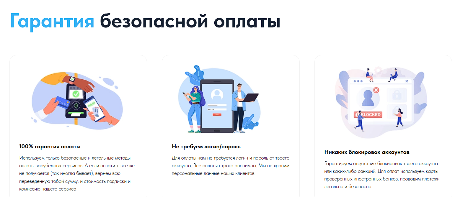 Клиентам обещают вернуть 100% средств, если оплата не прошла из-за каких-либо ошибок на сервисе. Менеджеры не требуют логины и пароли от оплачиваемых платформ, что повышает безопасность взаимодействия с ними.