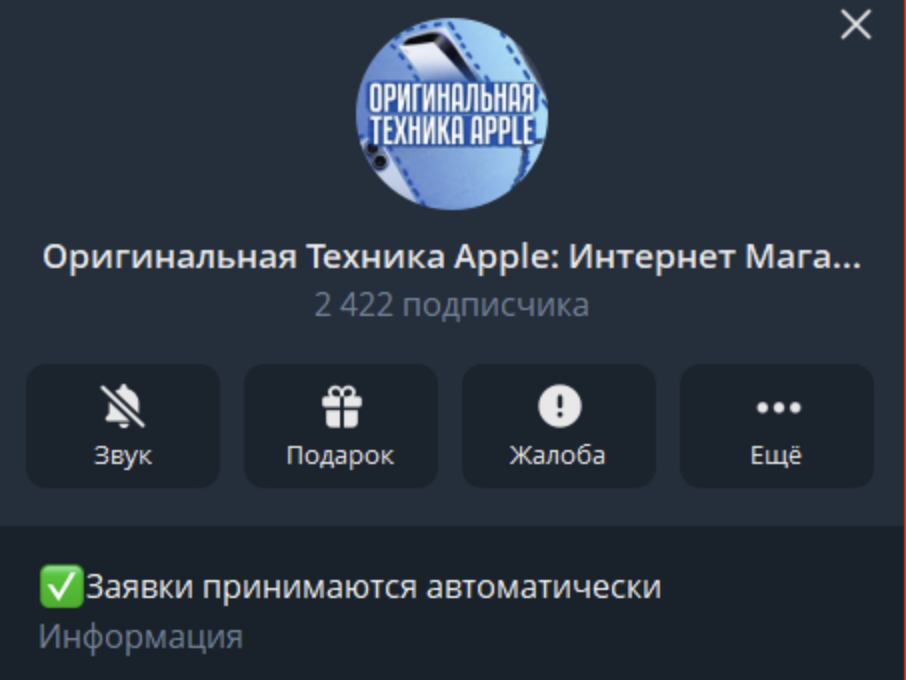 Продажи онлайн-магазина ведутся только через телеграм-сообщество «Оригинальная техника Apple». Канал не назвать популярным: подписчиков здесь менее 2500 человек. С учетом высокого спроса на технику Apple такая скромная аудитория вызывает недоумение. В шапке канала указано, что заявки на вступление в приватное сообщество принимаются автоматом.